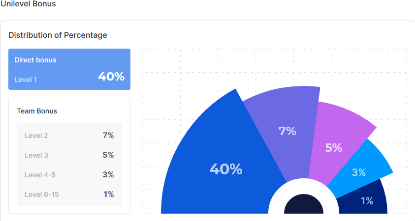 Additionally, when people in your team start recruiting their own members, you earn bonuses not only from your direct referrals but also from their extended teams. The percentage of commission decreases as the levels go down, following a clear 15-tier structure: 40% on level 1, 7% on level 2, 5% on level 3, 3% on levels 4 and 5, and 1% from levels 6 to 15. The system stops there: it does not go beyond 15 tiers. This ensures the program remains stable and balanced, with capped commissions that prevent unrealistic or unlimited earnings.
