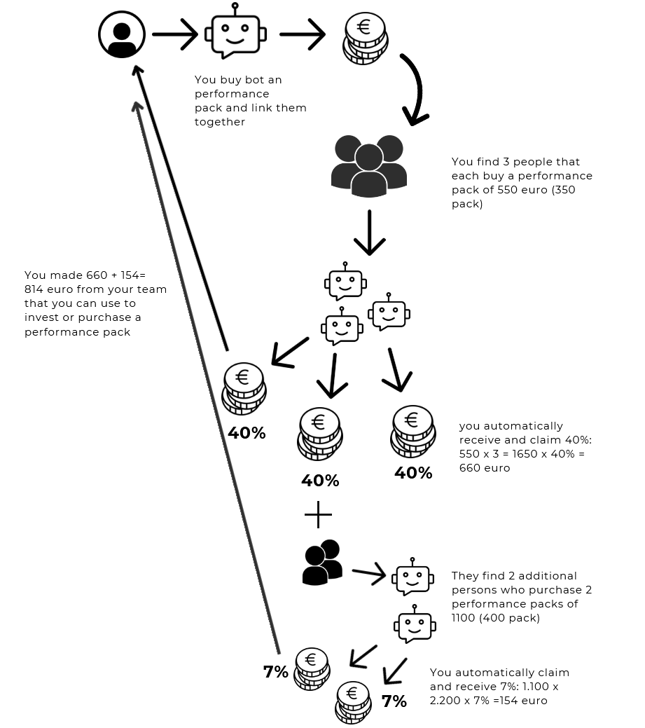 - For example if you are a builder and someone buys a bot, you will receive 40% of what they invest, however if they have someone under them, you will receive 7% of what that person invests in.