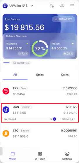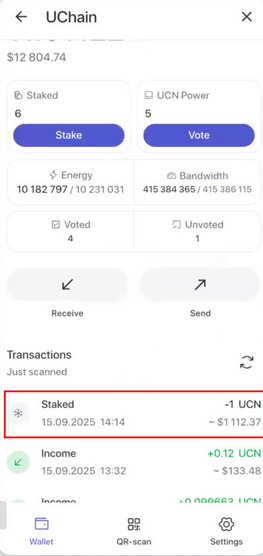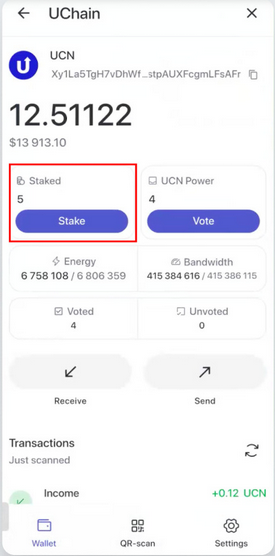 Tap OK to return to the UCN window. In the transaction list, you will see a staking transaction labeled "Staked.