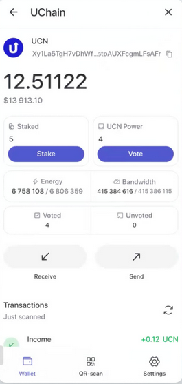 UCN Power — the amount of UCN Power, a resource required for voting. 1 UCN Power = 1 UCN coin staked for Energy or Bandwidth.
