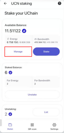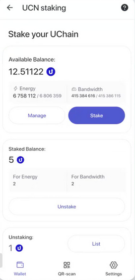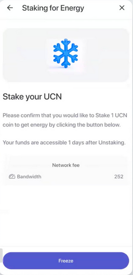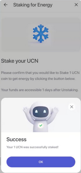 coins can be staked for either Energy or Bandwidth. 1 UCN Power = 1 UCN