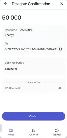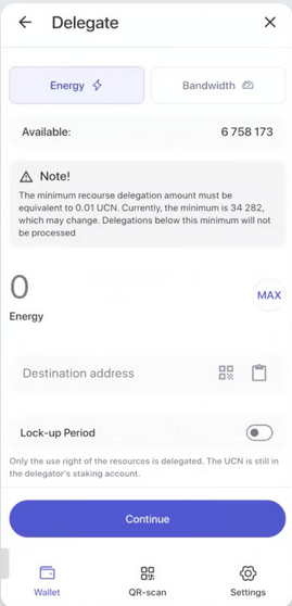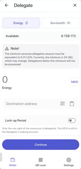 Energy you want to delegate. Below, enter the UCN wallet address of the