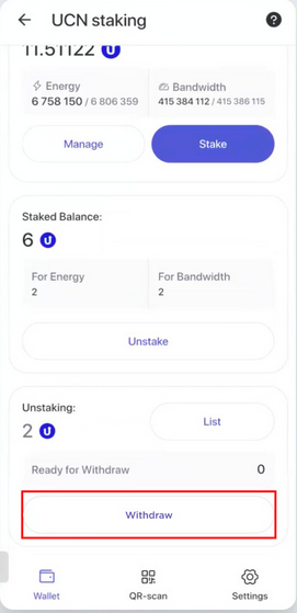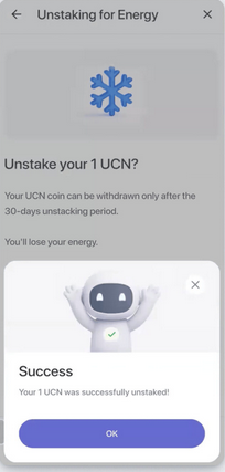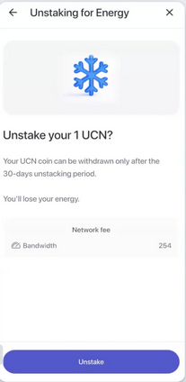 Note that after unstaking, a 1-month unstaking period begins. UCN withdrawal will be available after this period ends.