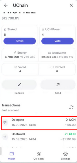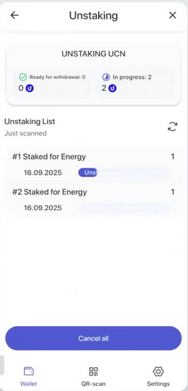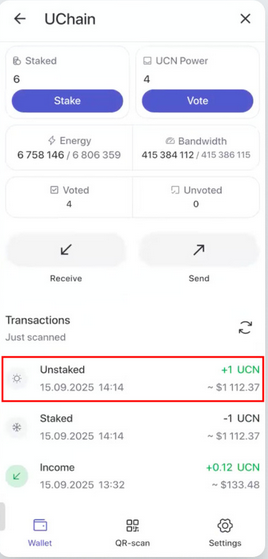 Tap OK to return to the UCN window. In the transaction list, you will see the staking transaction labeled "Unstaked.