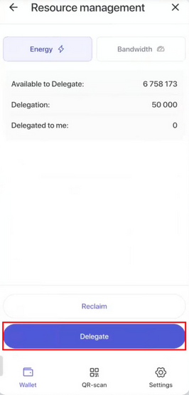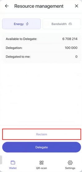 A screen will open showing which resources you delegated and to which address. Tap "Reclaim" to return them. Note that the "Reclaim" button will be available only after the delegation period you selected has ended.