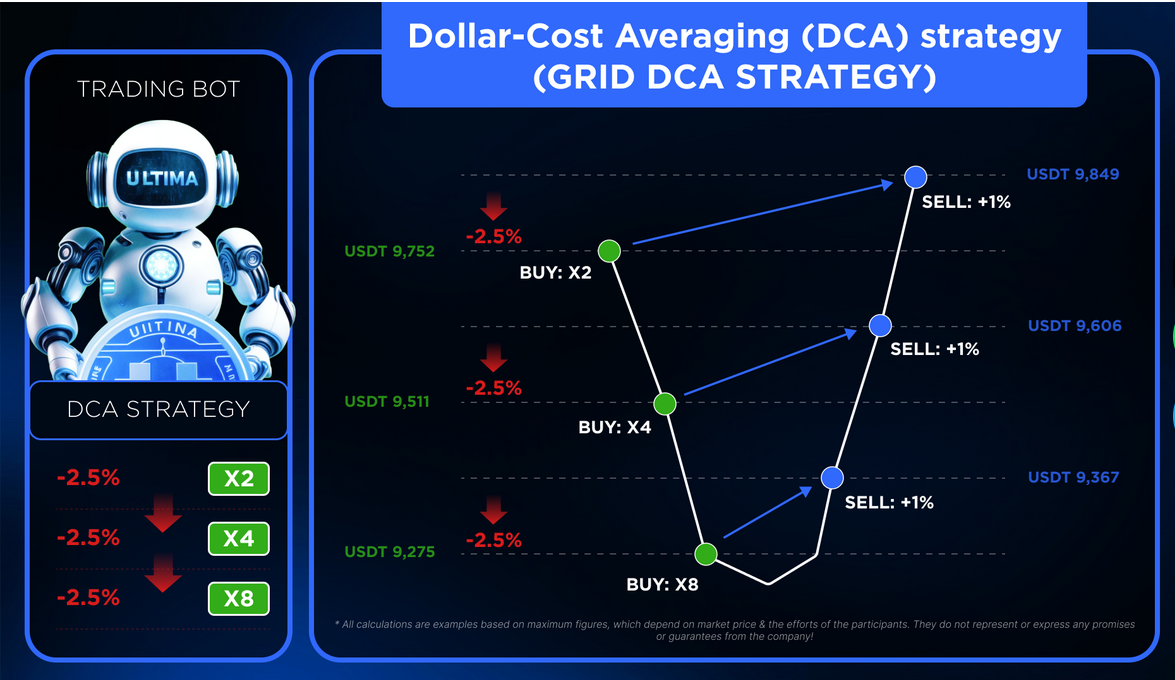 If the price keeps dropping more than 2.5%, the bot doubles its buy volume every 5th order (×2, ×4, ×8, etc.).